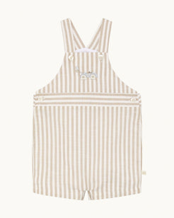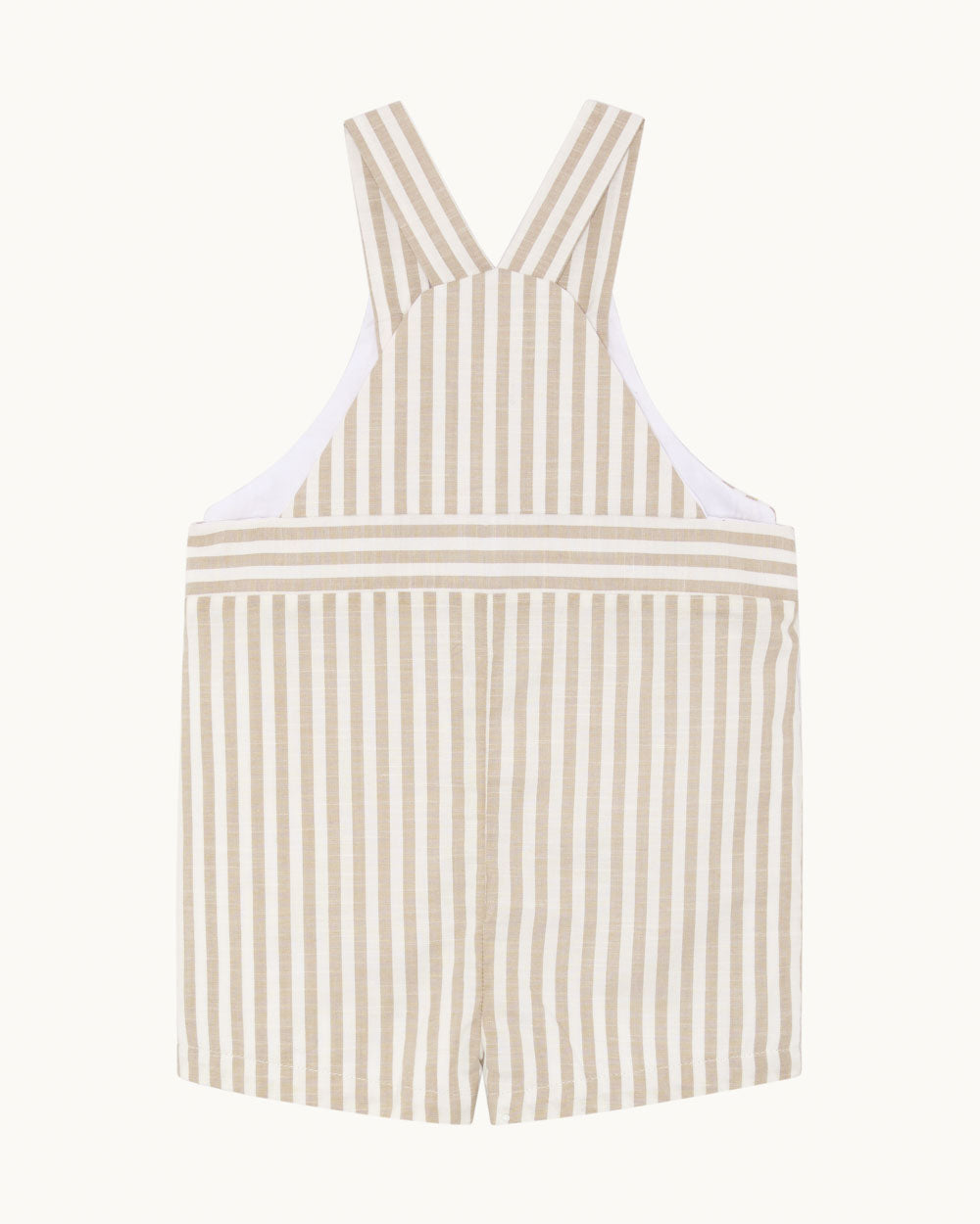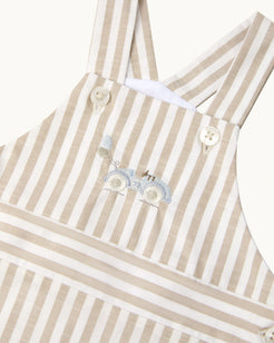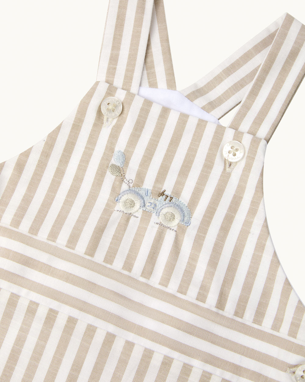 Soft Pima cotton dungarees detailed with an embroidered Little Race Car and MC buttons at the front. Finished in a vertical stripe pattern in sepia.