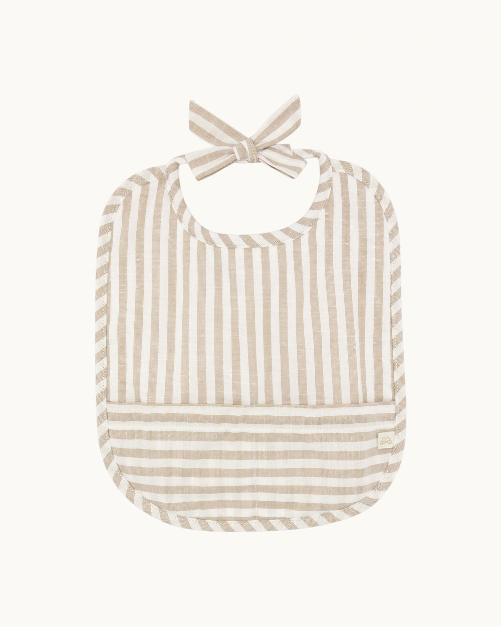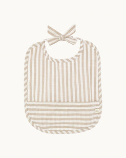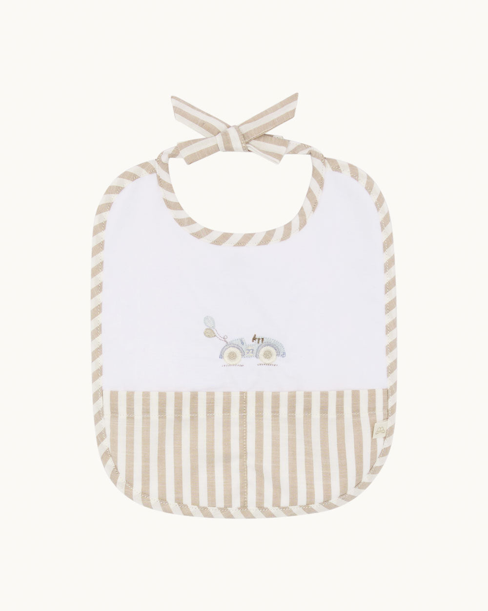 A set of soft cotton bibs featuring an embroidered Little Race Car and finished with a vertical stripe pattern in sepia. Designed with popper fastenings at the back of the neck for ease when putting on and removing, and detailed with a decorative bow tie.