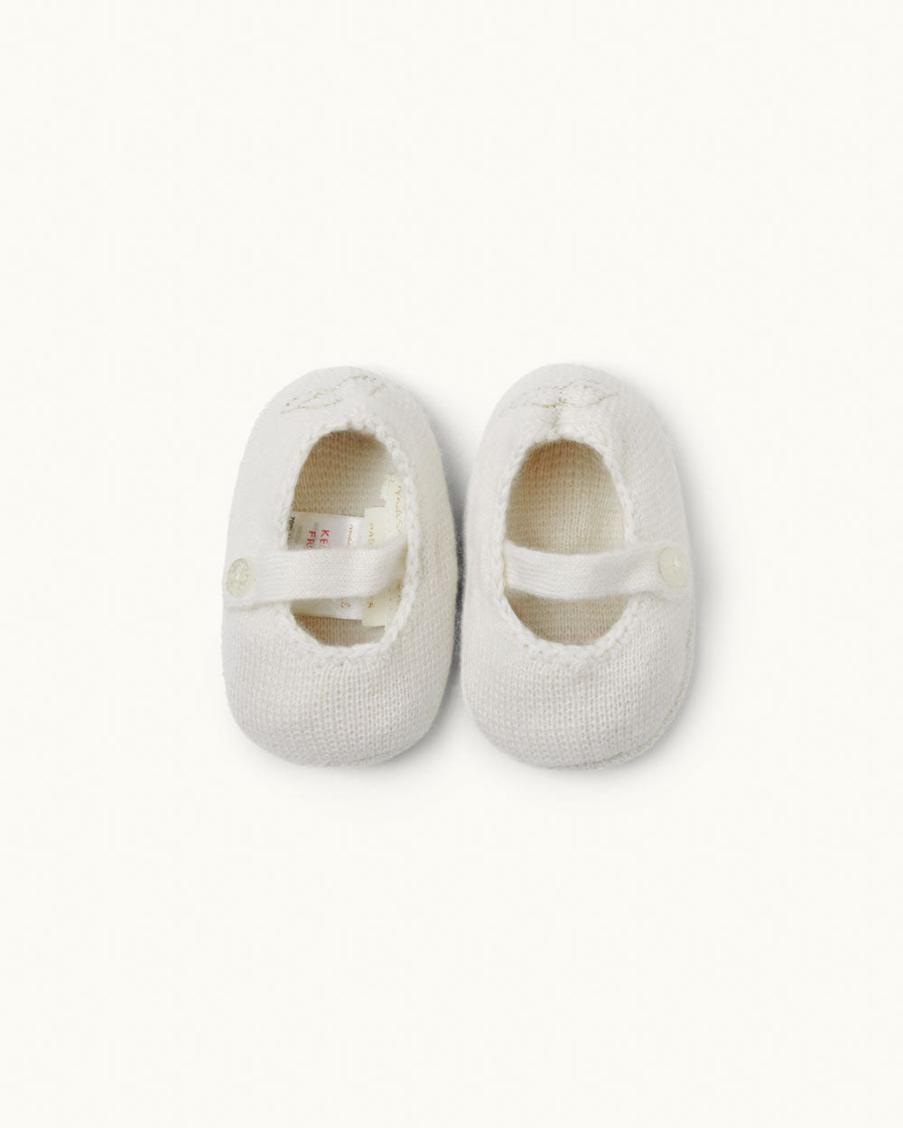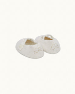 A darling first step — the Ari Baby Slipper is crafted from a luxurious cashmere/wool blend with lightly wadded soles for softness and comfort. Featuring our signature Angel Wings and MC button-closure straps, they are perfect for little feet.