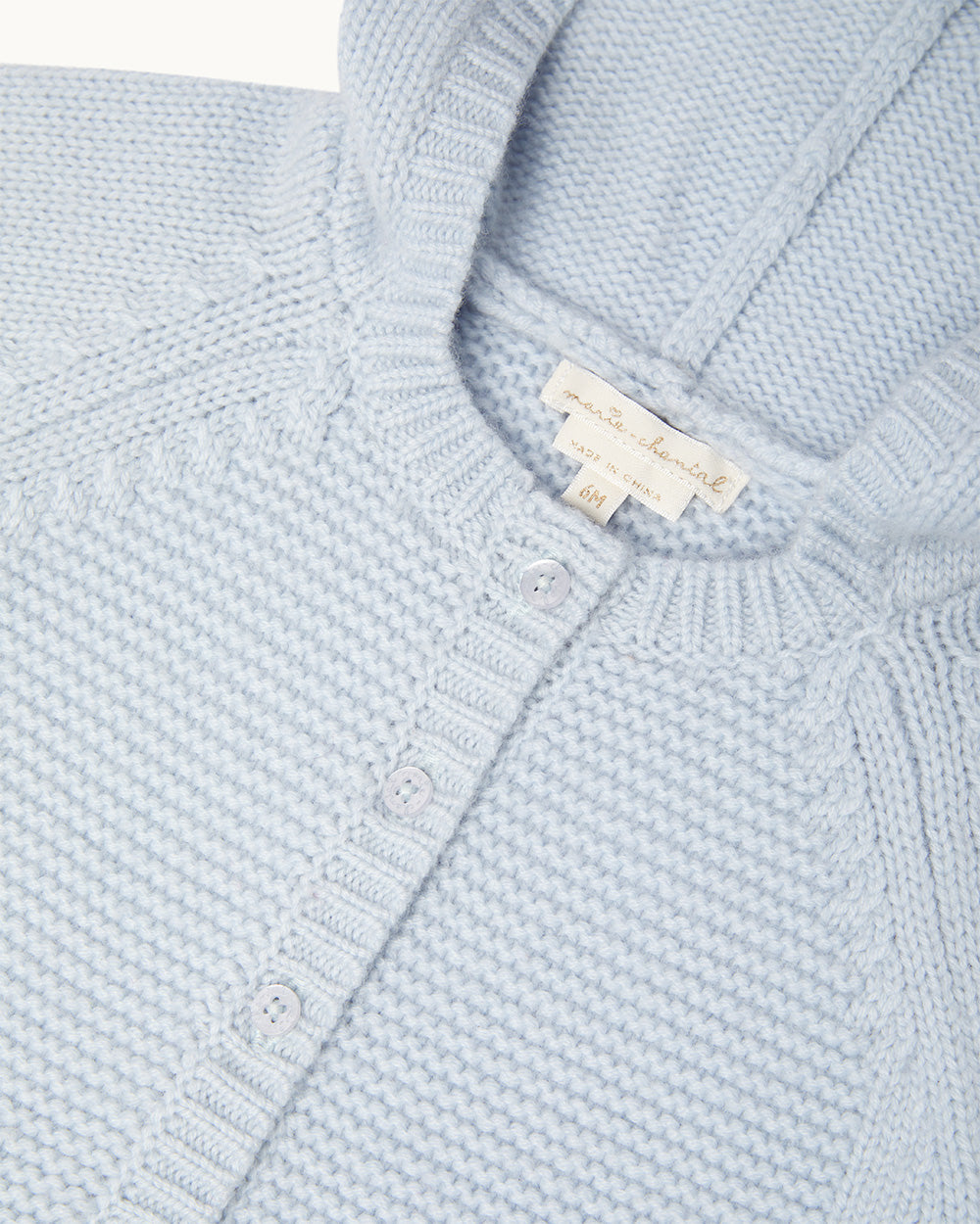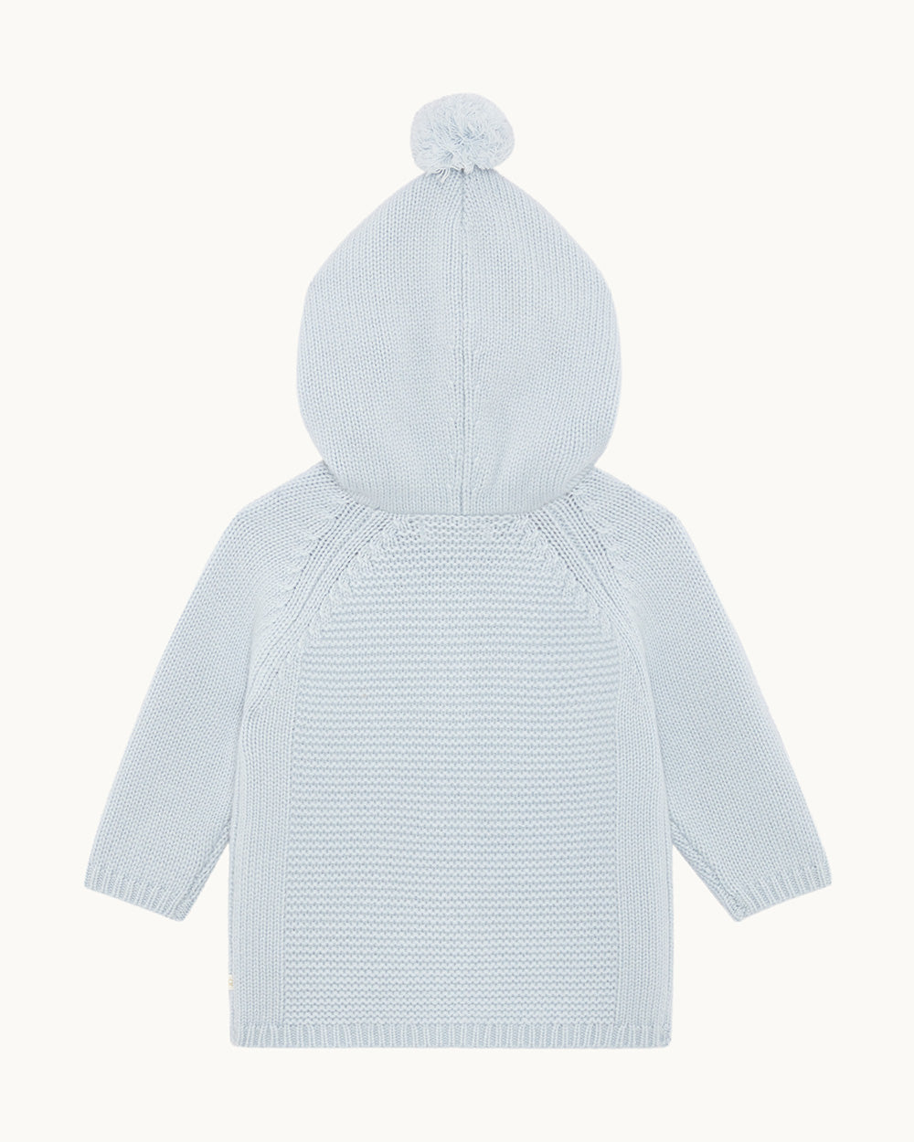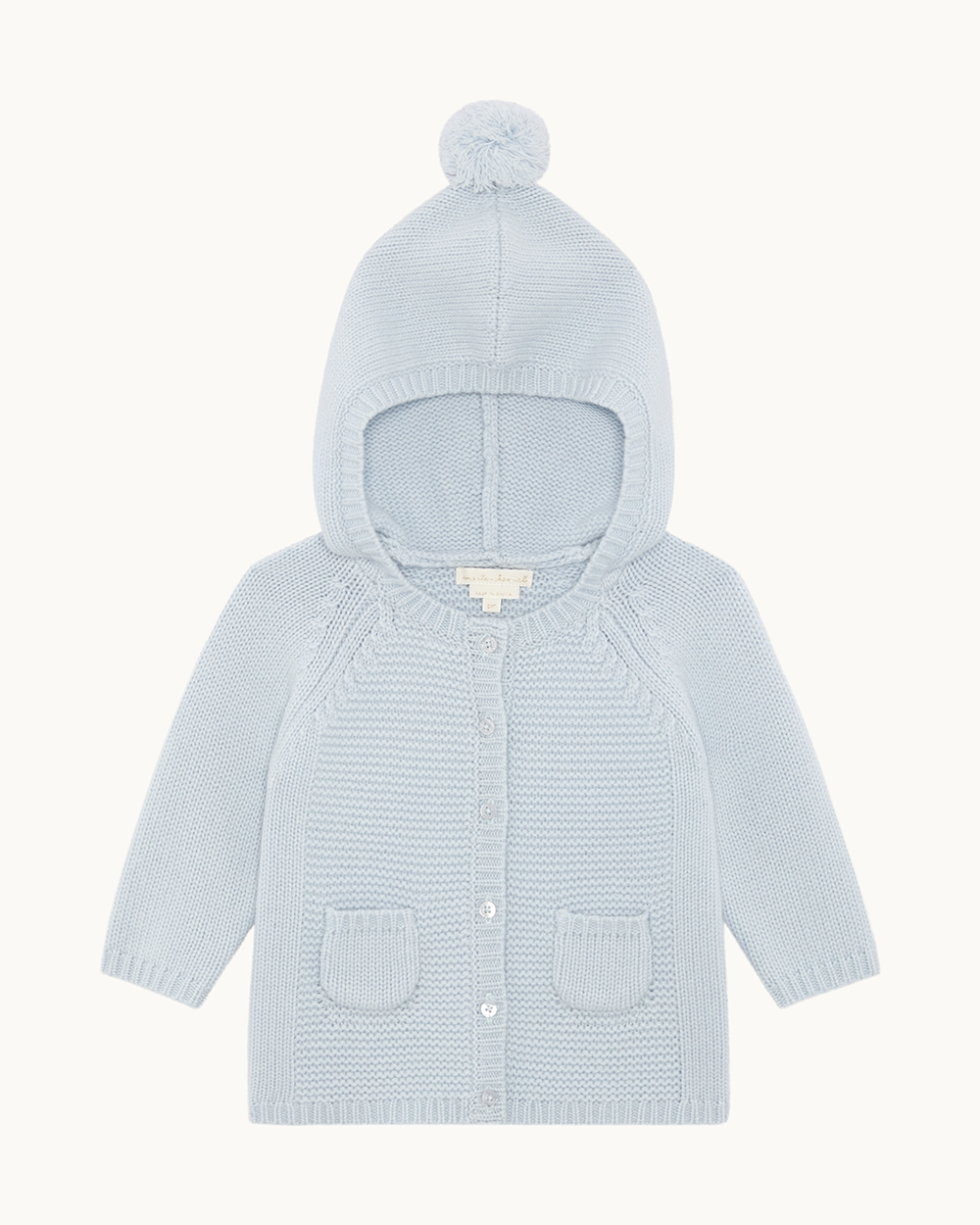 A timeless essential with a whimsical twist, the Bo Knitted Pram Cardigan for baby features a hood with pom-pom detail, MC branded buttons, and pearl stitch accents. A cosy layering piece made for passing down.