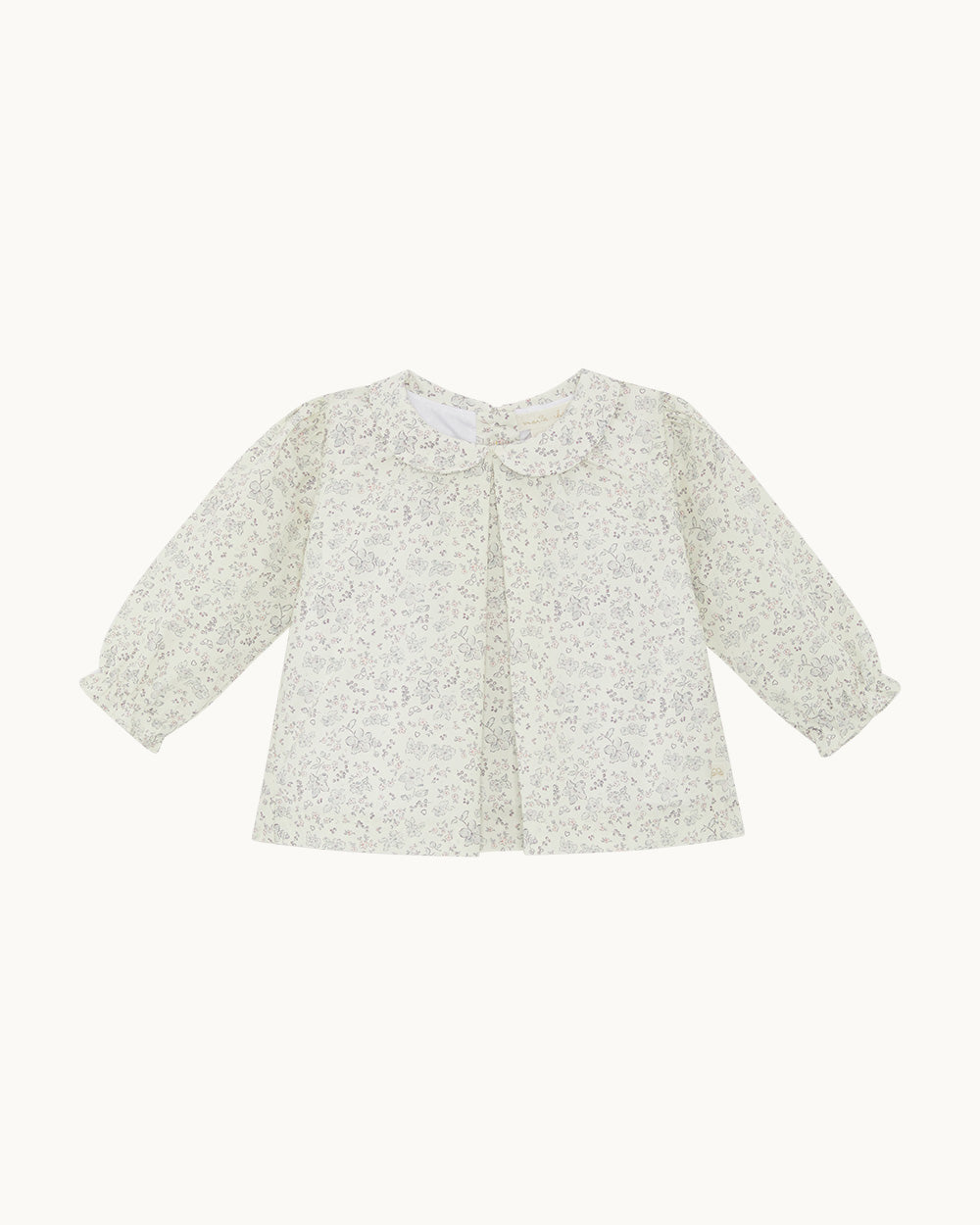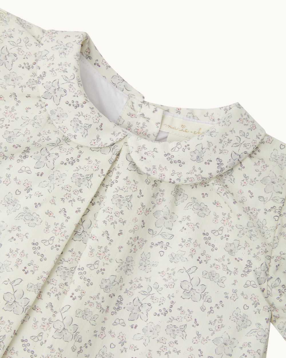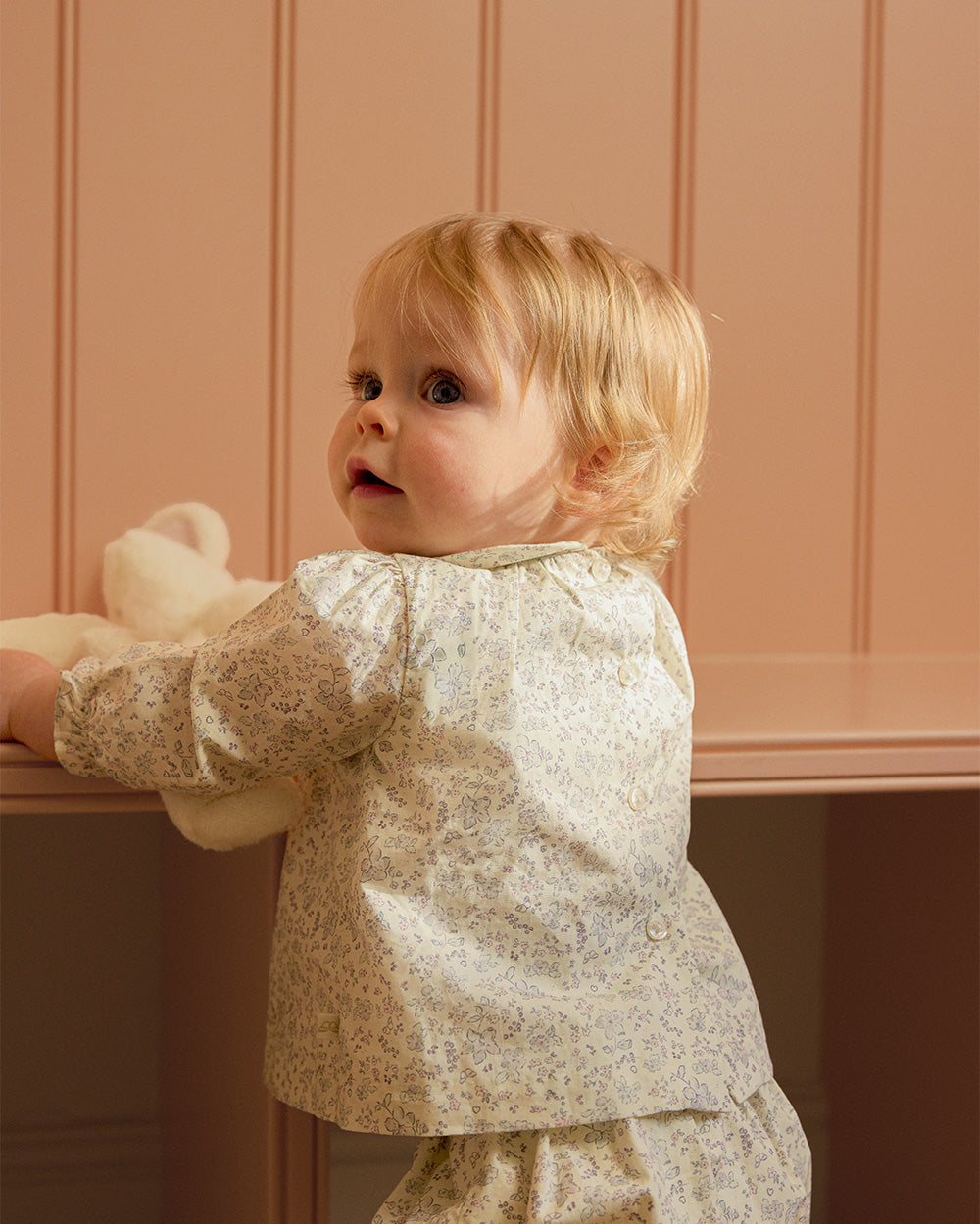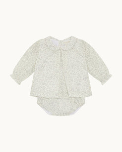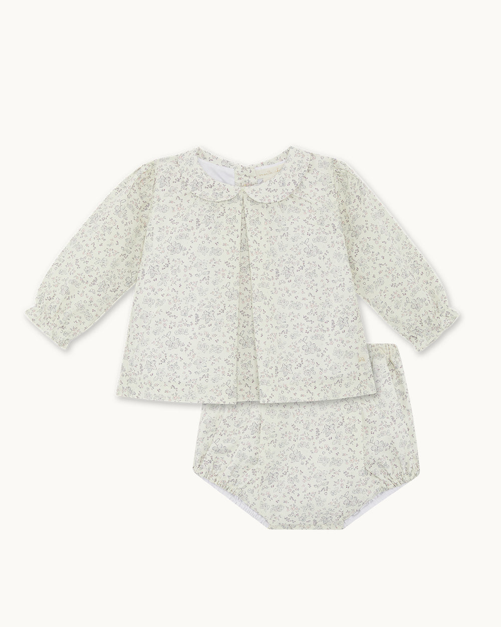 Introducing the Bonnie Athena Blouse and Bloomers Set, designed in the Athena floral print, featuring delicate florals in soft lilac and sandstone tones. This charming baby girl outfit is made with 100% cotton for all day comfort, and is perfect for both casual and special occasions.
