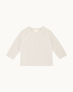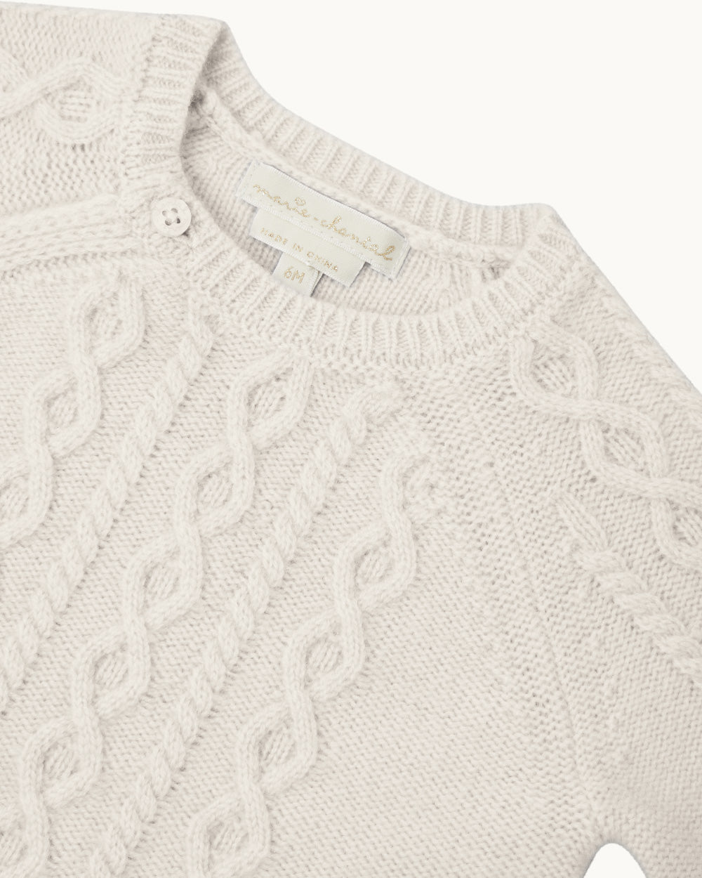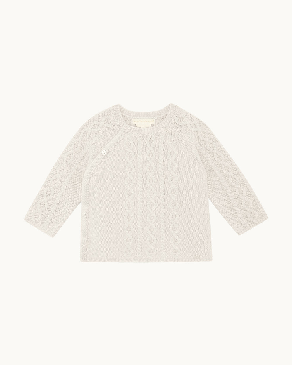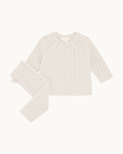 This elegant cable knit set for baby includes a wrap-style cable cardigan and coordinating leggings with faux bow detail. Designed for warmth and easy dressing, it’s the perfect gift for new arrivals or stylish daily wear.