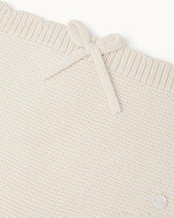 A knitted cotton trouser in a soft, spring-weight knit, finished with scalloped edges at the waistband and cuffs. The fine knit provides gentle warmth and a comfortable, flexible fit.