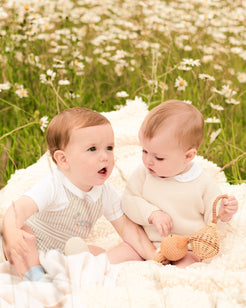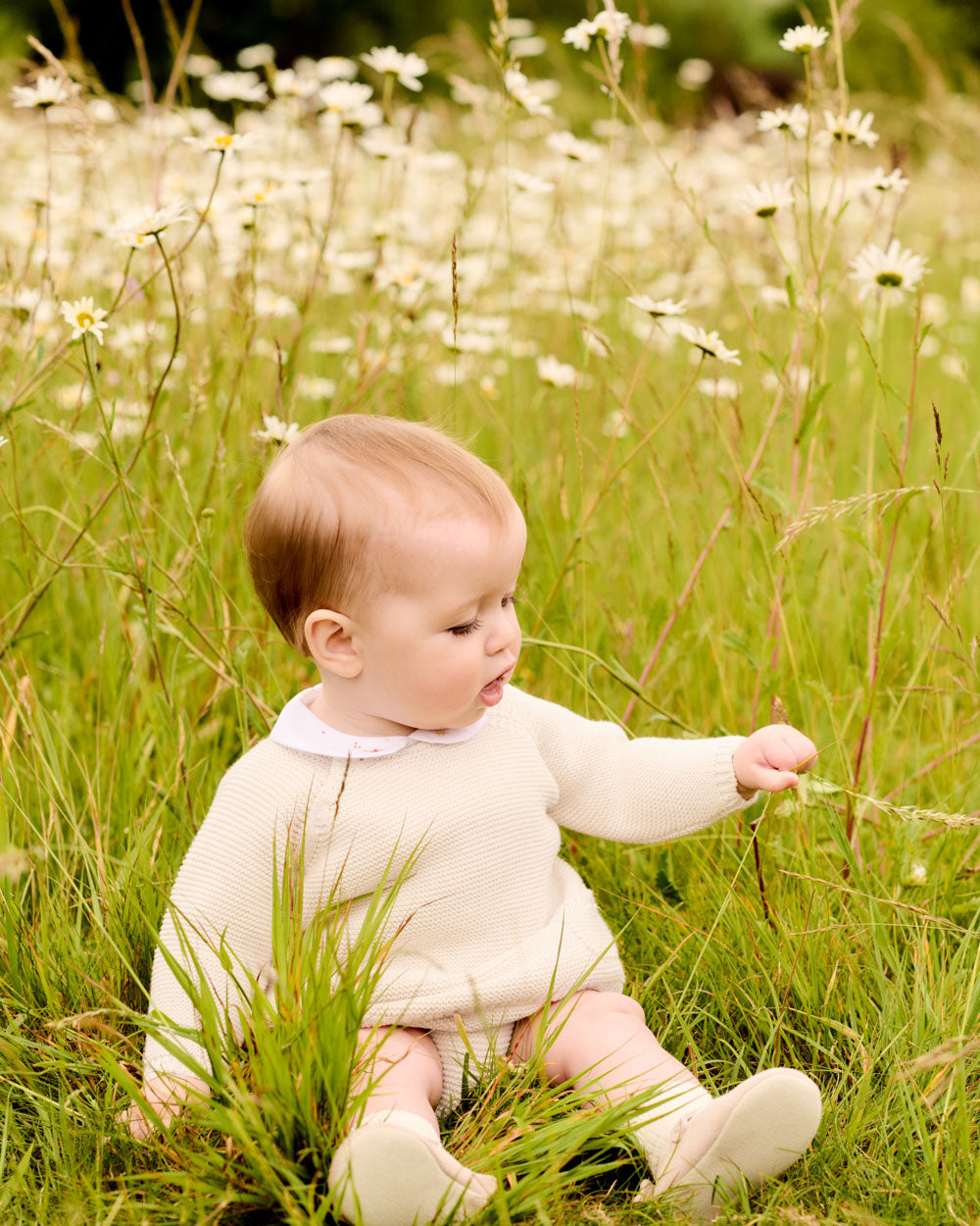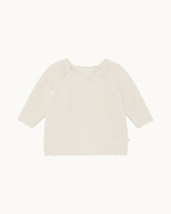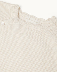 A knitted cotton wrap cardigan in a soft, spring-weight knit, finished with scalloped edges at the collar and cuffs. Designed to layer over spring and summer outfits, it provides gentle warmth without added weight.