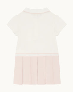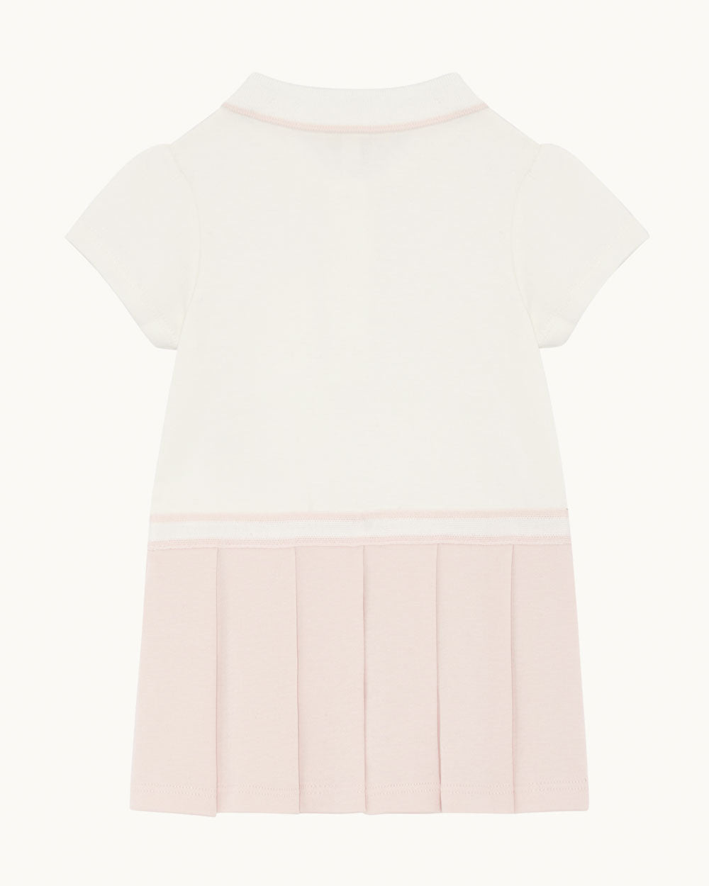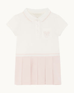 Soft cotton shapes this dress in classic MC Pink, detailed with a knitted stripe collar and subtle tennis embroidery. MC buttons at the back allow for easy dressing.