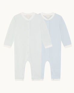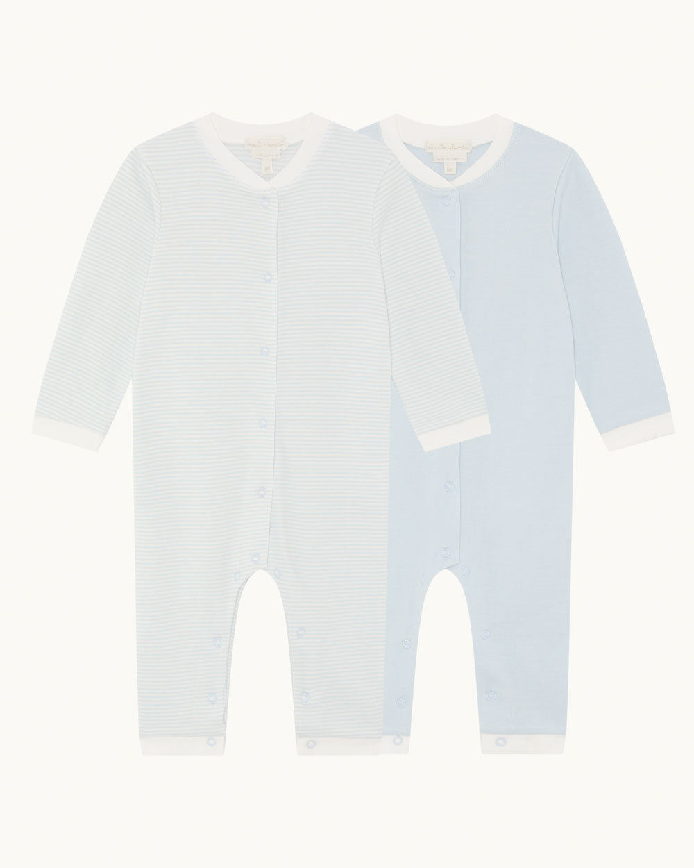 Made from soft organic cotton, this two-pack romper set includes one striped design and one in a solid colour, in our classic MC Pink and MC Blue tones. Each romper features a Henley collar and popper fastenings for effortless dressing and changing.