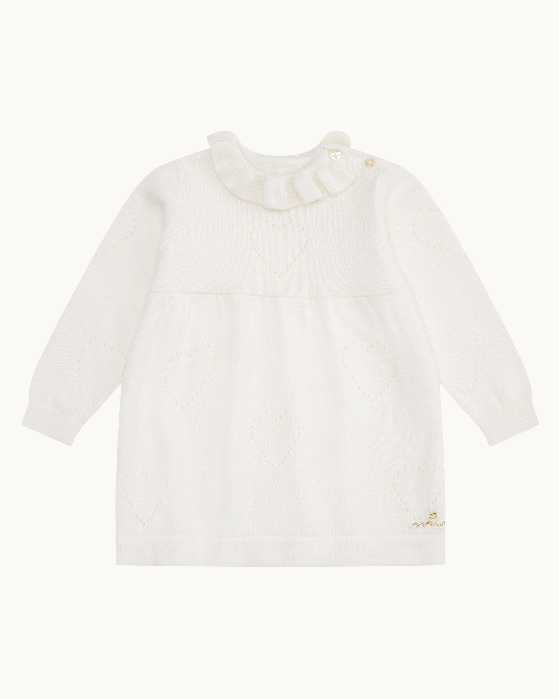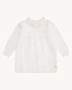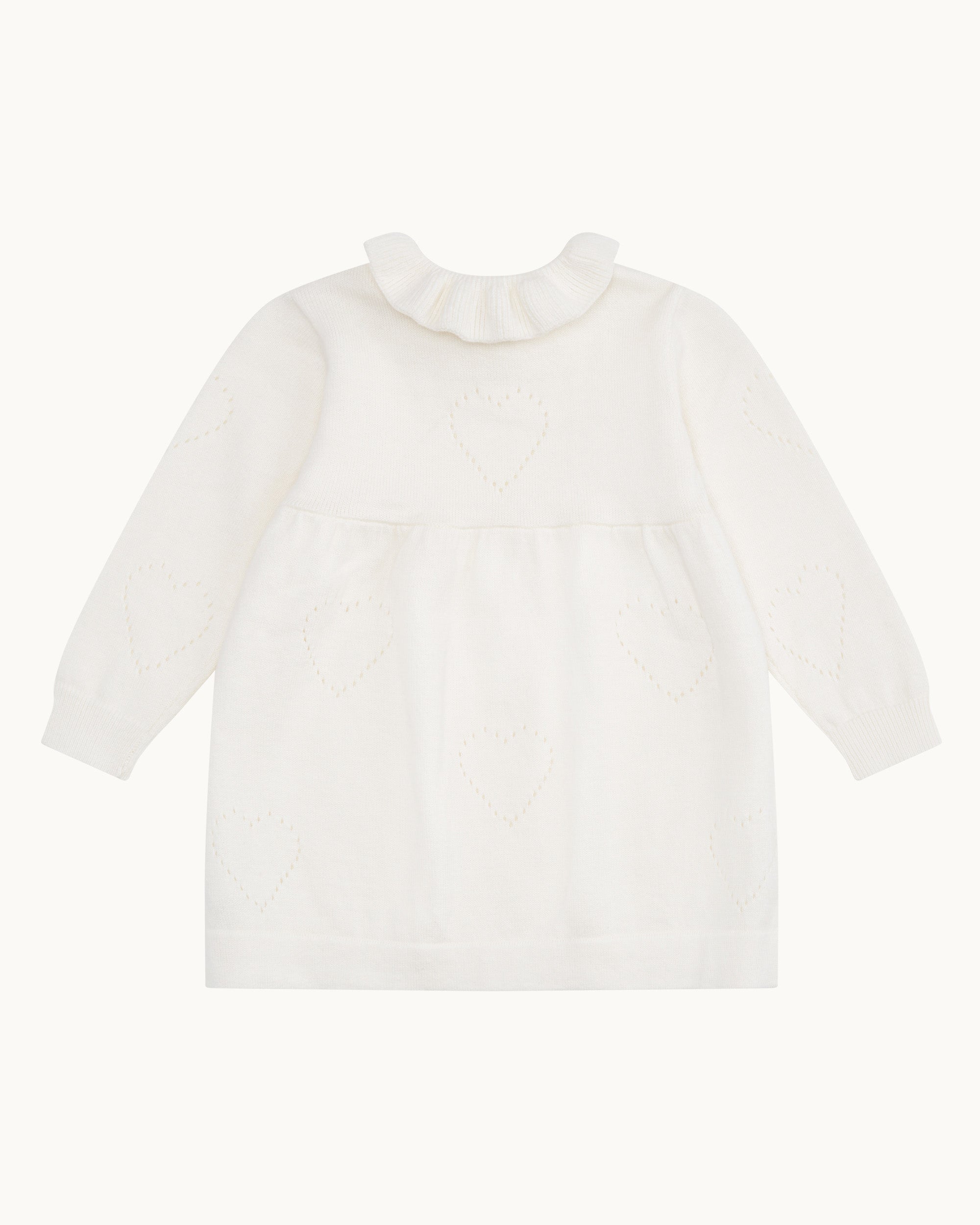 Made from the softest cotton and cashmere, our Knit Heart Dress features a soft ruffle collar and delicate heart pointelle detailing. Designed with comfort and quality in mind, perfect for playtime or special occasions.