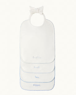 From morning till night, this charming bib set will keep your little one's ensemble clean. Embroidered with Breakfast, Lunch, Tea and Supper, there's a bib covered for every occasion.