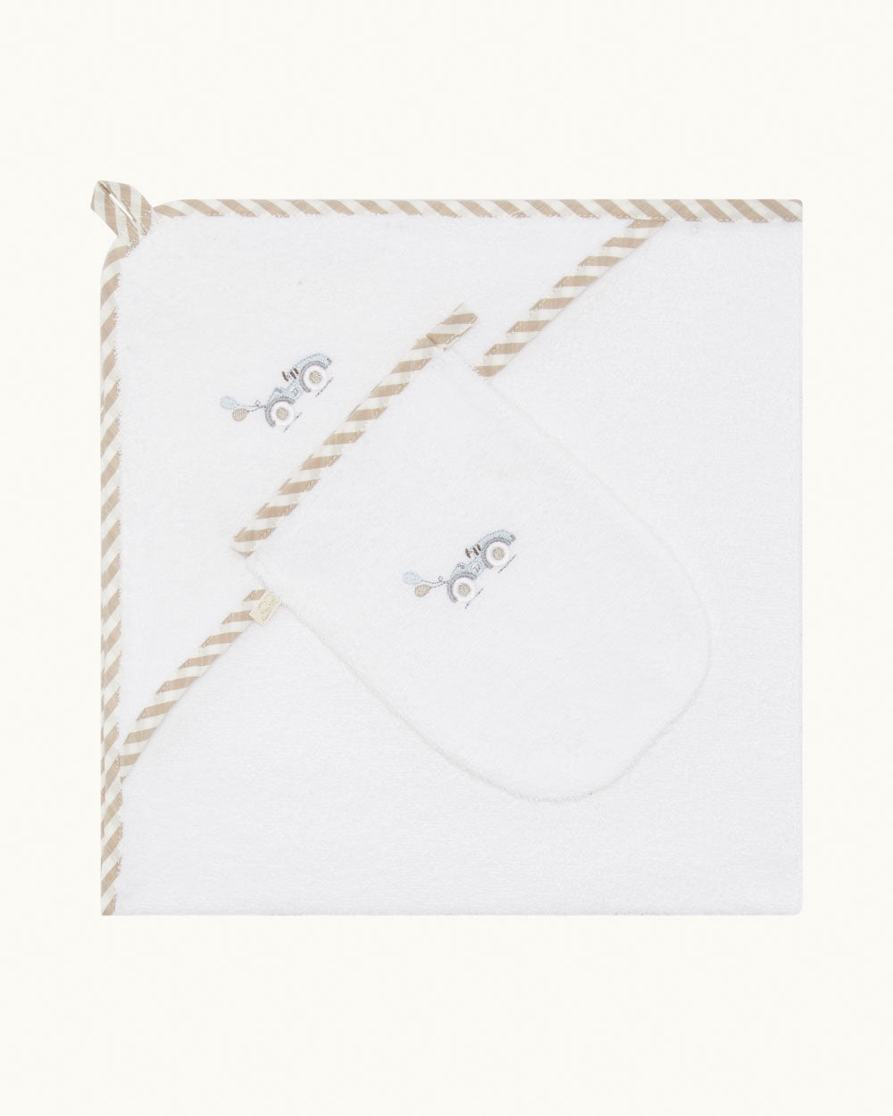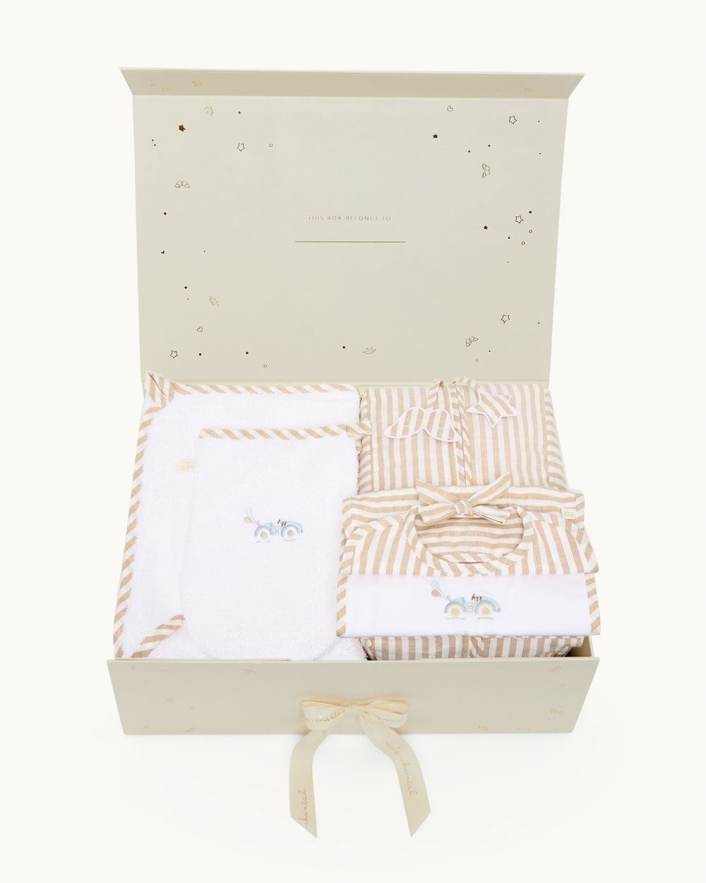 Thoughtfully designed for everyday comfort and special moments alike, this baby gift set includes a coordinated trio of baby essentials – a bib set, quilted wash bag and bath time set, all crafted in a charming vintage Race Car print.