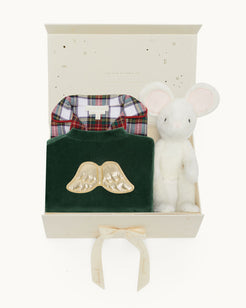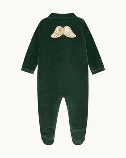 - Signature Angel Wing Sleepsuit in the softest velour with golden angel wings and festive green colourway